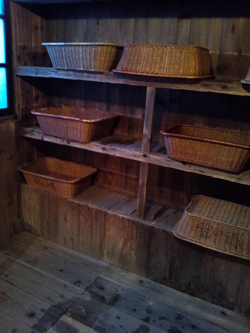 脱衣所はみなこんな感じで、カゴと棚があるだけ。