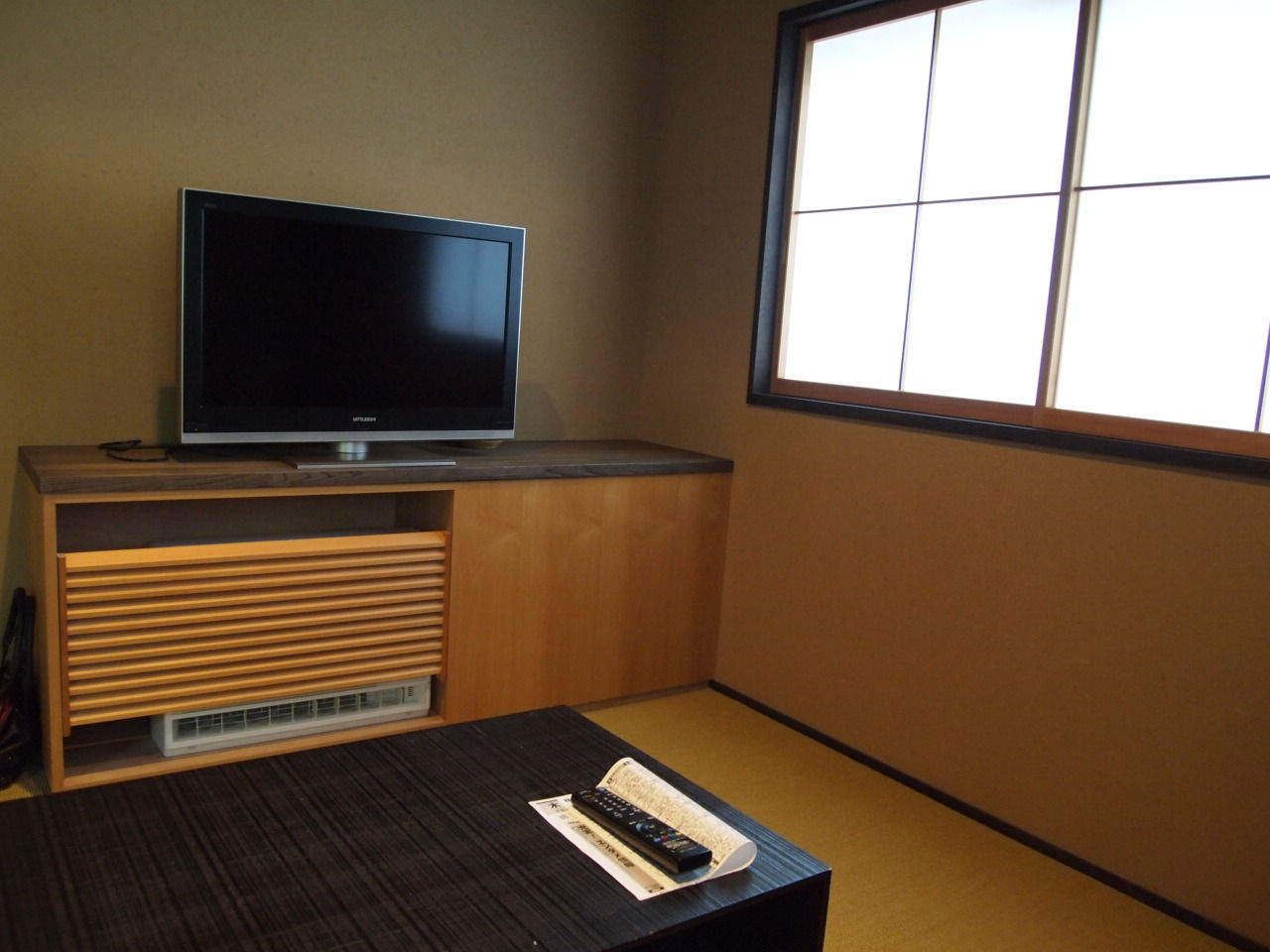 こちらにテレビがあります。 このお宿、全体的に湿度高め。 このお部屋は大浴場近くの上、一階には露天付き客室があるので余計そうなのかもしれないけど。
