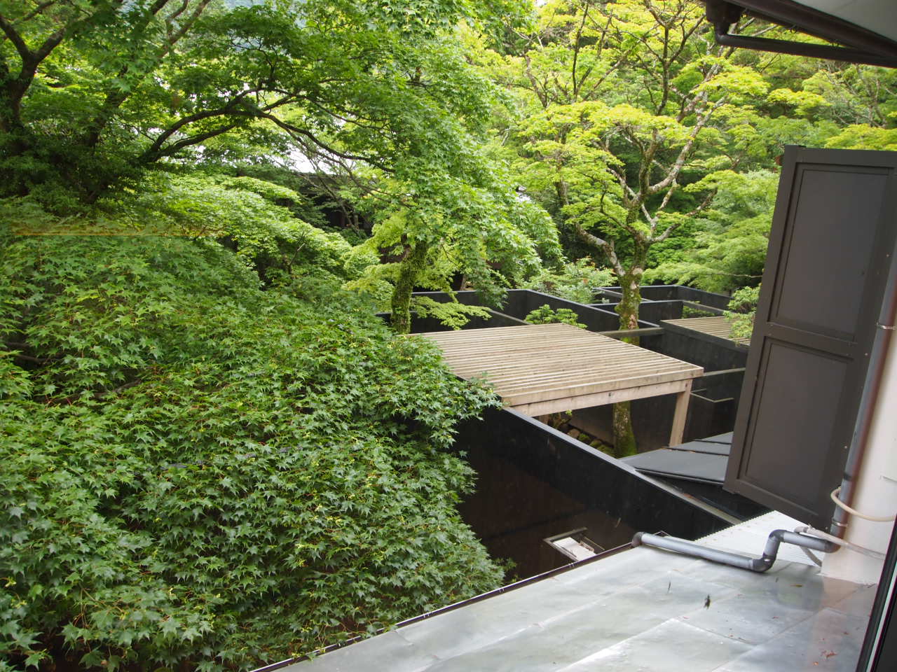 窓からぐいっと横を見ると、メゾネットのお部屋の露天を隠した塀が。。