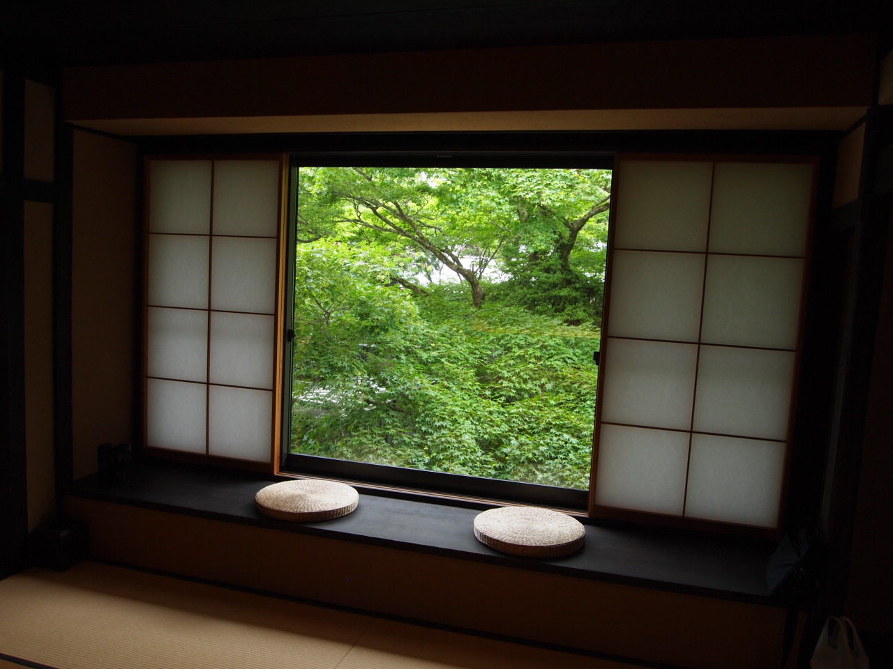 青々した木々が見える窓辺。 腰掛けてまったりもできます。
