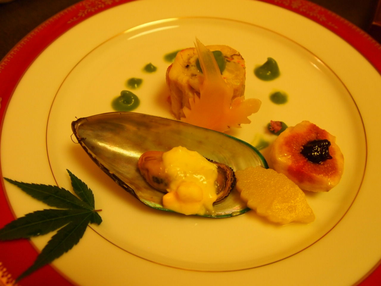 洋皿っぽく仕上げてありますね~。 なんだか色が悪く撮れてしまって悔しいのだけど、金目鯛がくるくると巻いてあって、ふっくらと優しいお味( ̄m ̄〃) ムール貝も普段はあまり得意でないけど、美味しくいただけました♪ 横に添えられてる無花果が実は一番ハマッた。。。 イチョウの葉はさつまいもです。