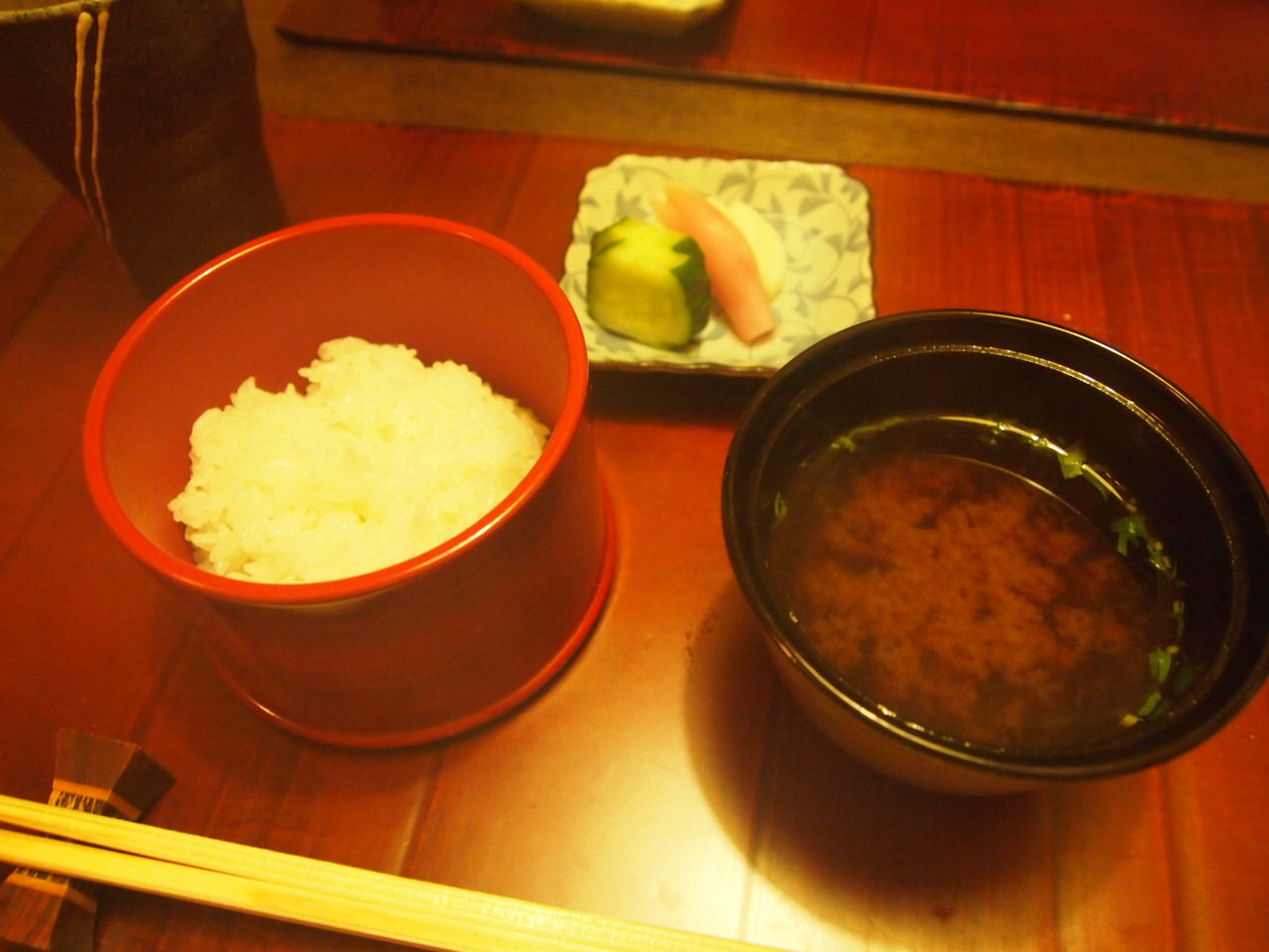 赤出汁に三種の香の物。