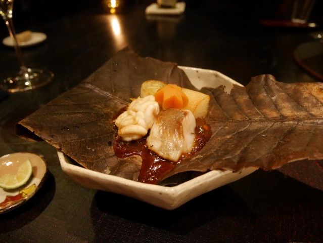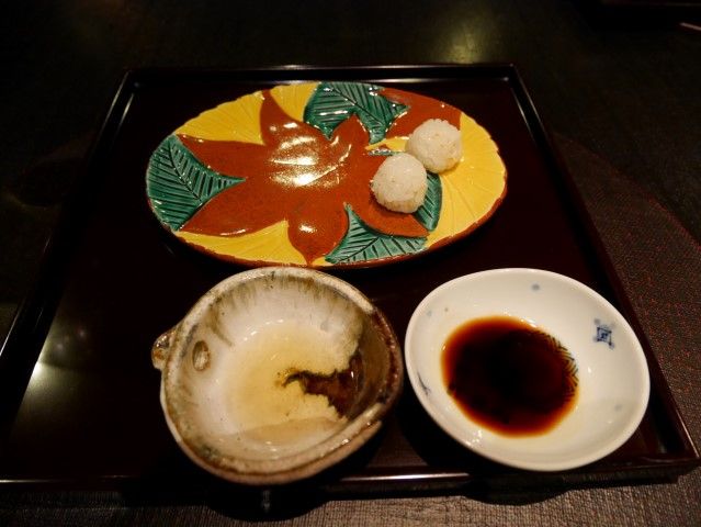 銀杏・むかご串と安納芋カステラ 烏賊燻製このわた掛け