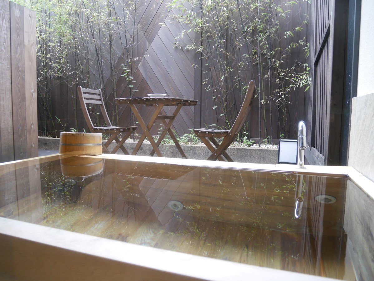 檜の露天風呂とテラスあり