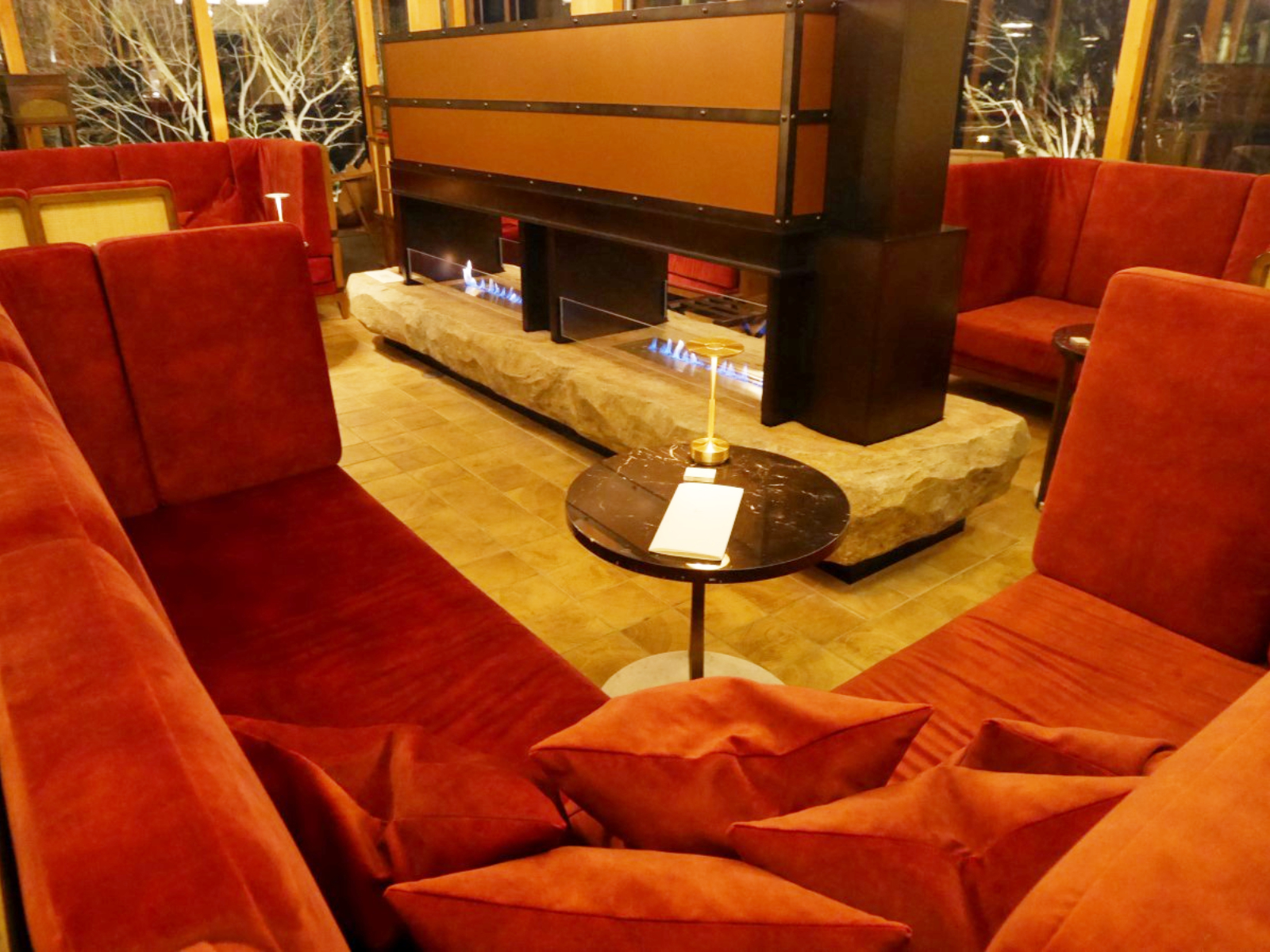 中央にエタノール暖炉が燃えて