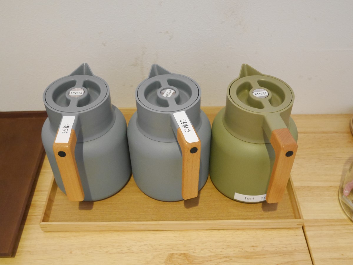 廊下に「麦茶」「温泉水」「コーヒー」