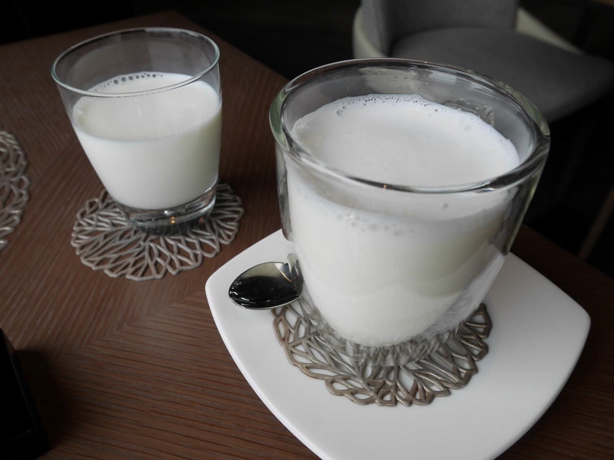 (ワタシはホットミルク、連れはドリンクコーナーから冷たい牛乳を)